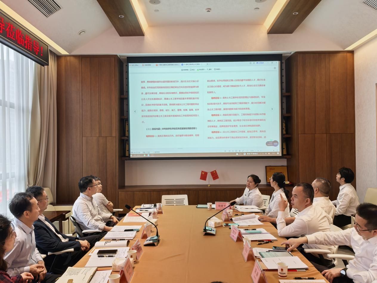 覃祖聪书记介绍了公司土木工程专业的发展现状及工程教育认证工作的进展情况。他指出,工程教育认证是提升专业建设水平、增强员工竞争力的关键举措,需要企业全程参与,共同确保培养目标与行业需求紧密衔接。周月娥副经理结合认证标准,重点探讨了课程体系优化、实践基地建设、企业导师聘任等合作方向,希望企业为专业建设提供宝贵建议。
