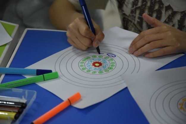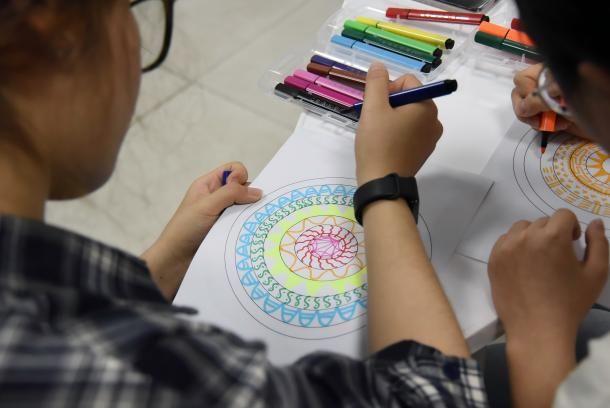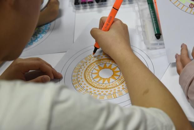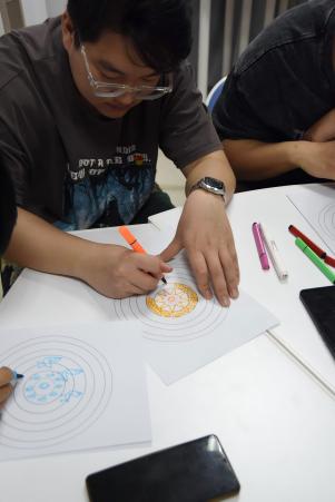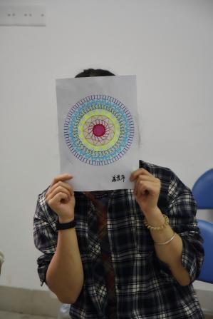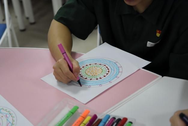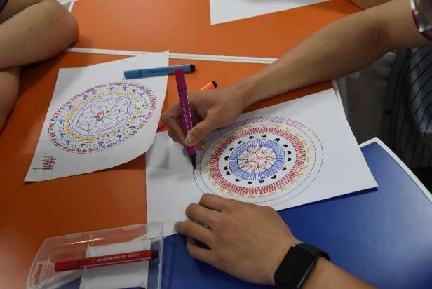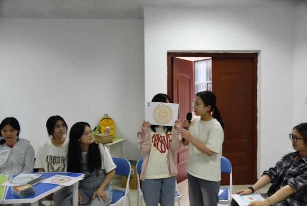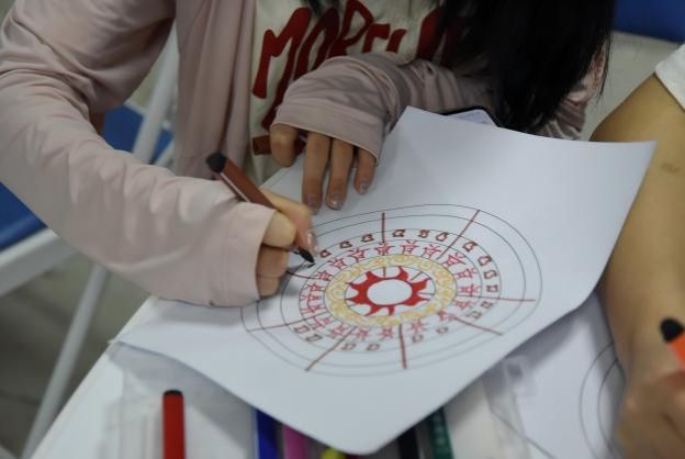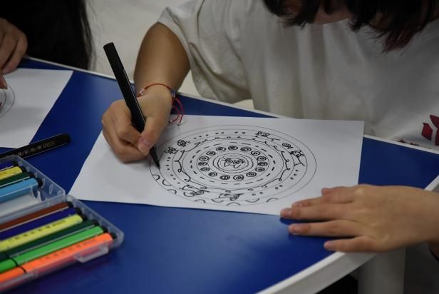 结合壮族非遗铜鼓文化,党员们在主题音乐的浸润中进行“铜鼓曼陀罗”绘画创作。活动邀请到材料与环境公司辅导员、“和你‘艺’起”艺术疗愈工作室成员玄濮睿老师带领员工党员学习壮族铜鼓纹饰文化,并引导创作属于自己的铜鼓纹饰。铜鼓纹饰作为壮族文化的瑰宝,蕴含着丰富的历史和文化内涵。党员们在绘制过程中,深入了解太阳纹、蛙饰纹等纹样所代表的自然崇拜、祈愿丰收等寓意,感受到中华民族文化的多元一体和博大精深。