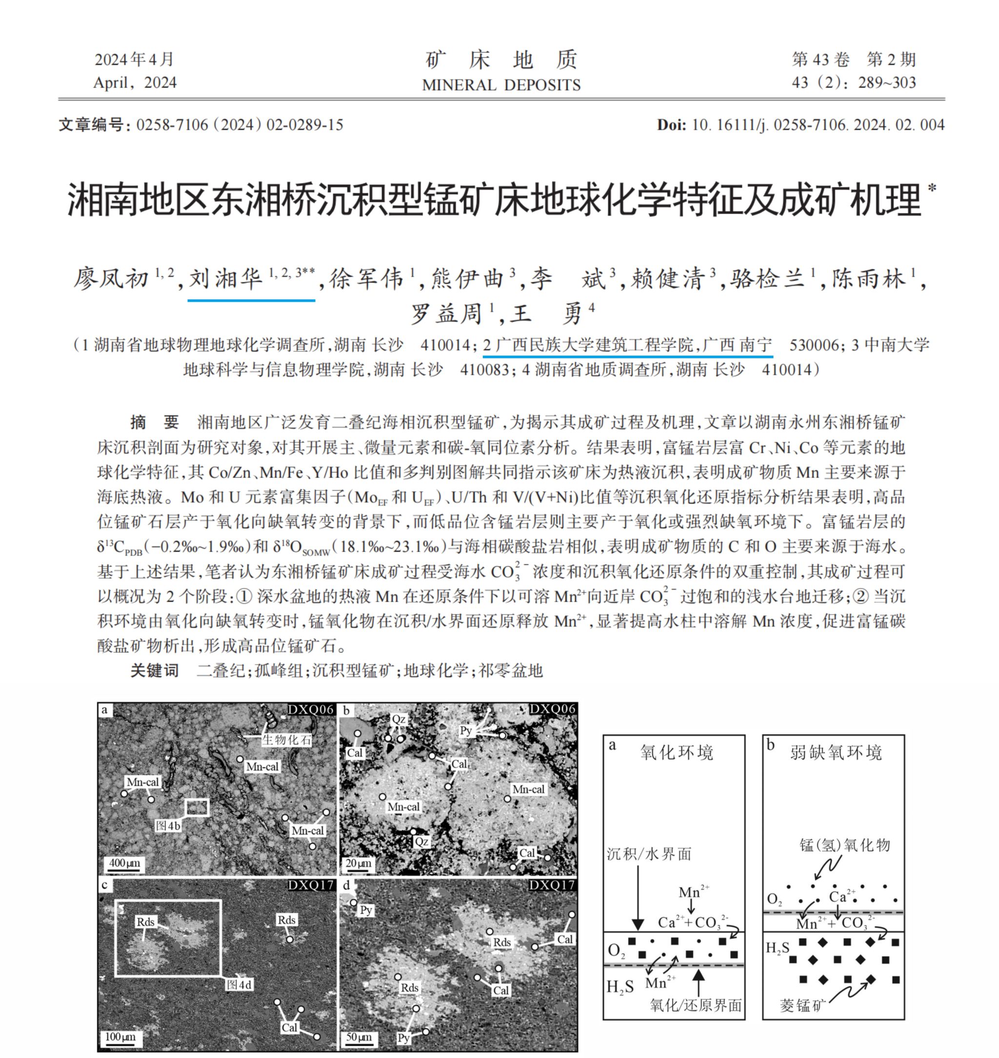 该研究成果依托公司与湖南省地球物理地球化学调查所联合开展的横向科研项目“湘南地区东湘桥锰矿沉积地球化学及矿床成因研究”,以祁零盆地东湘桥锰矿床为研究对象,通过扫描电镜、主微量元素及碳-氧同位素分析等技术手段,揭示了二叠纪海相沉积型锰矿的成矿机理,提出成矿过程受海水CO₂浓度和沉积氧化还原条件双重控制的新观点,为该区域矿床研究提供了重要参考。