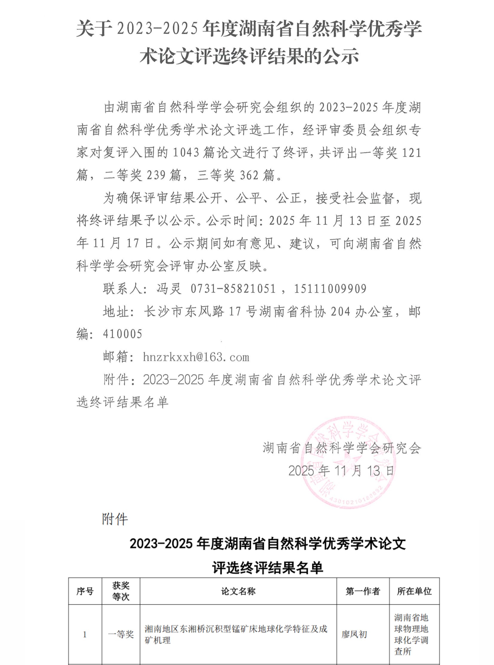 近日,2023-2025年度湖南省自然科学优秀学术论文终评结果公示,太阳成集团tyc522cc岩土力学与地质过程团队刘湘华老师作为通讯作者的学术论文《湘南地区东湘桥沉积型锰矿地球化学特征及成矿机理》荣获一等奖。